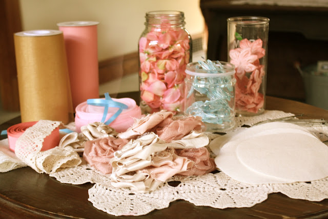 I took some time in the days before to make several fabric flowers. If you need some ideas of how to put these together here are two good tutorials. I hot glued mine together.